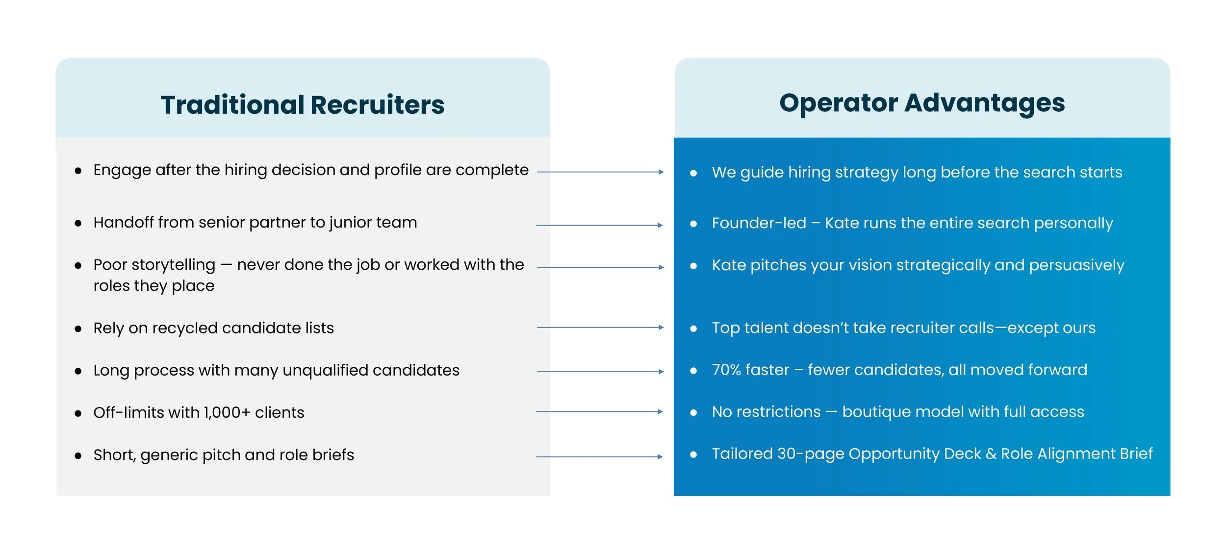 “We met Kate through a trusted network and she quickly proved herself during our critical CRO search following our $120M raise. Even against a well-known firm, her energy, insight, and ability to deliver top candidates stood out immediately. She impressed us with her advice on the profile and made the hard part choosing between great options. Kate is a true strategic partner and our go-to for future executive searches.”